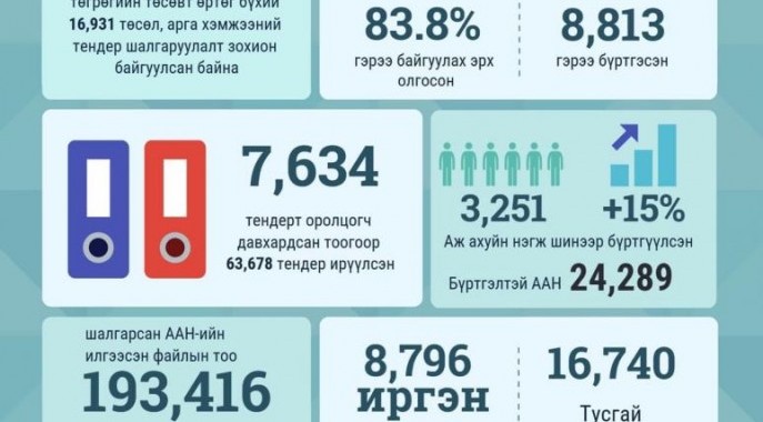 2024 онд www.tender.gov.mn цахим системээр 26.6 их наяд төгрөгийн төсөвт өртөг бүхий 16.931 төсөл, арга хэмжээний тендер шалгаруулалт зохион байгуулсан бол цахим дэлгүүрээс 1058 захиалагч 9733 удаагийн захиалгаар 85....