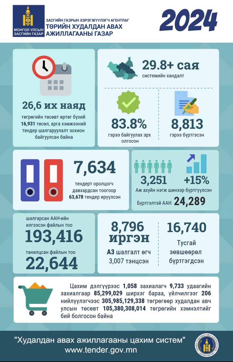 2024 онд www.tender.gov.mn цахим системээр 26.6 их наяд төгрөгийн төсөвт өртөг бүхий 16.931 төсөл, арга хэмжээний тендер шалгаруулалт зохион байгуулсан бол цахим дэлгүүрээс 1058 захиалагч 9733 удаагийн захиалгаар 85.299.029 ширхэг бараа, үйлчилгээг206 нийлүүлэгчээс 305.985.129.338 төгрөгөөр худалдан авч улсын төсөвт 105.380.308.014 төгрөгийн хэмнэлтийг бий болгосон байна.