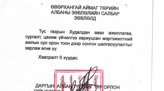 ХУДАЛДАН АВАХ АЖИЛЛАГАА ХАРИУЦСАН МЭРГЭЖИЛТЭНИЙ АЛБАН ТУШААЛЫН ТОДОРХОЙЛОЛТ...