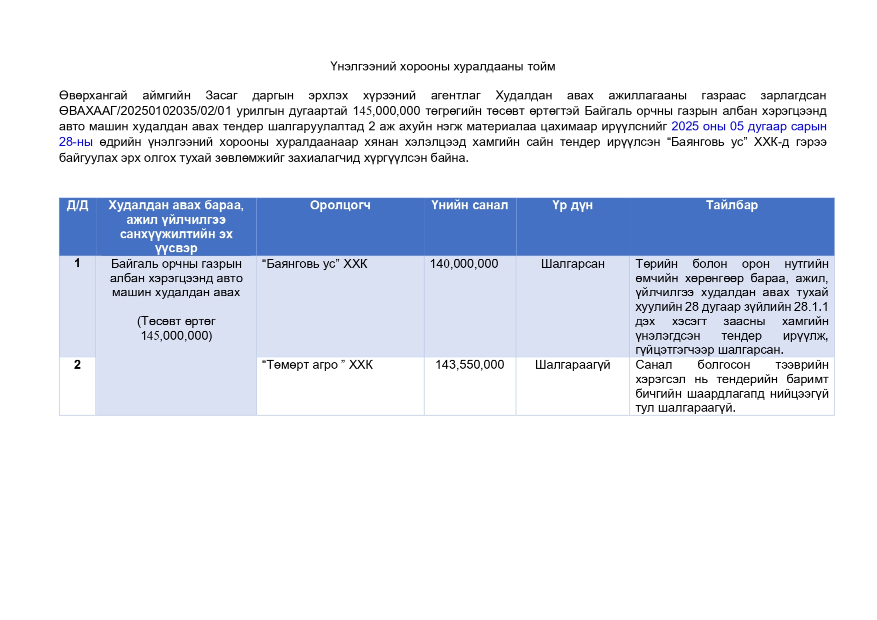 - Тендер шалгаруулалтын үр дүн